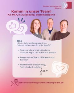 Unsere Schmerzkonferenzen finden regelmäßig jeweils am 1. Montag des Monats ab 18:30 in unserer Praxis statt. Die Anmeldung von Fällen die Sie besprechen möchten, können Sie telefonisch unter der Nummer 0251 - 4843444 oder über unser Kontaktformular vornehmen. Mehr erfahren.